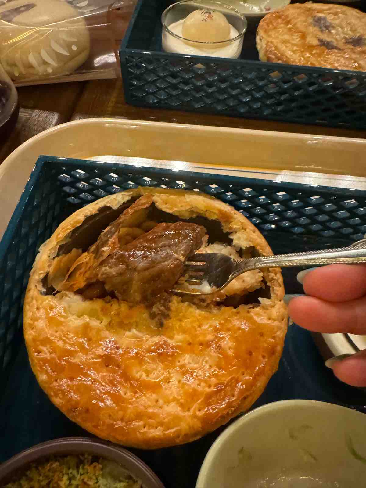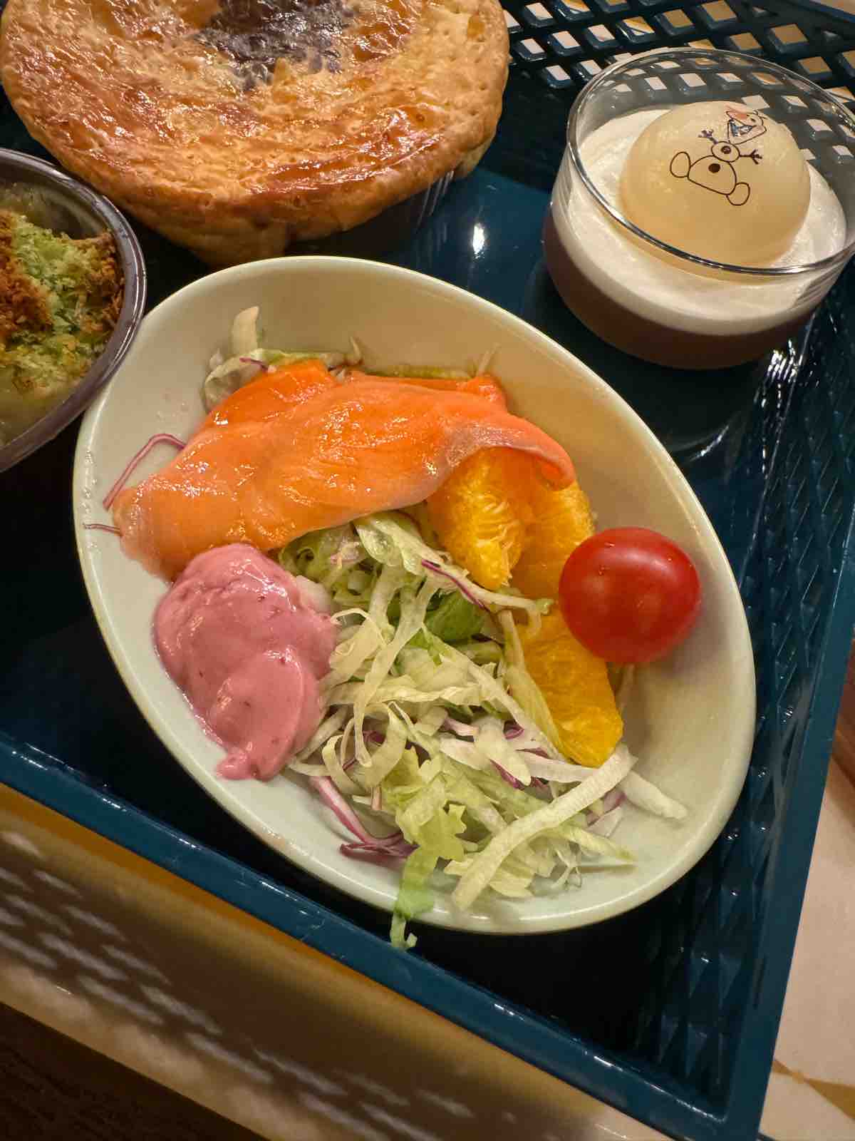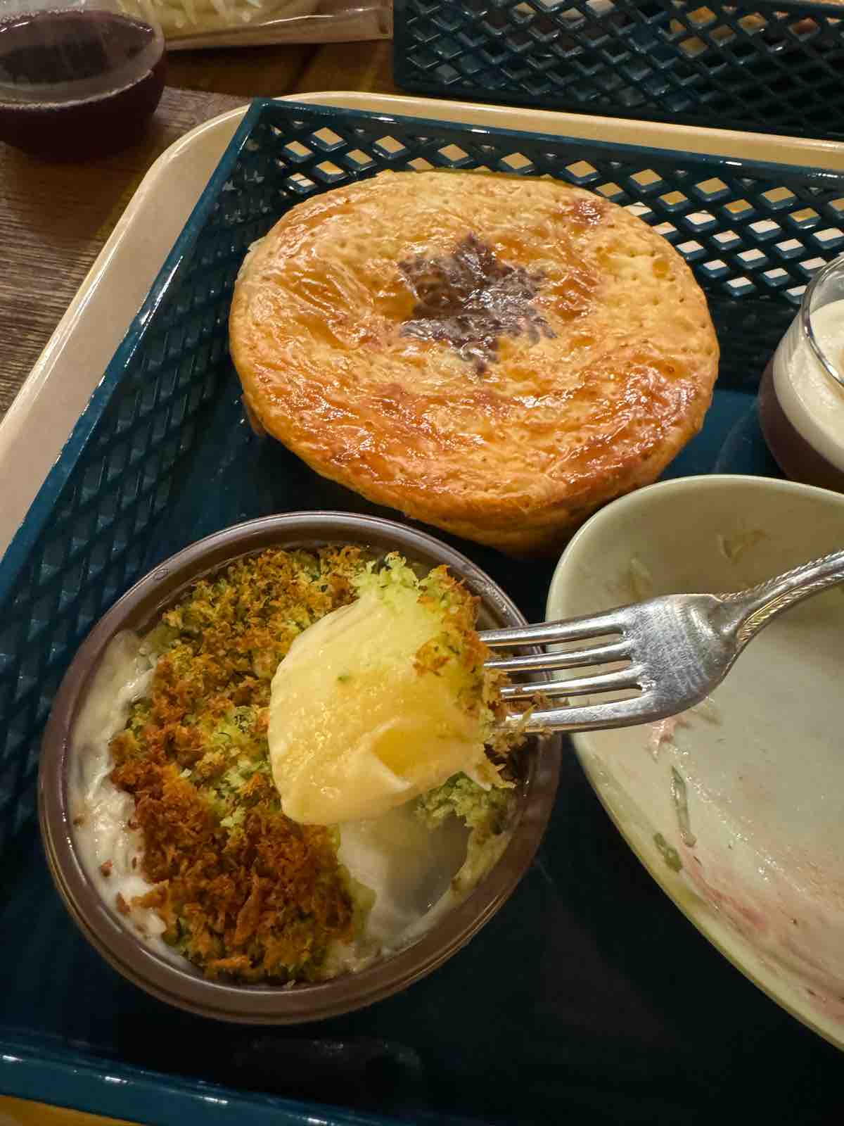 サラダに丸ごと芋が入ったグラタンに、シチュー、パン、デザートも付いていて結構なボリュームです。